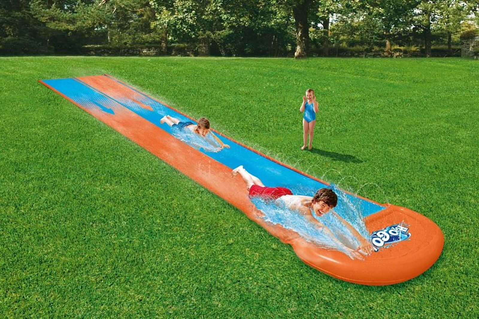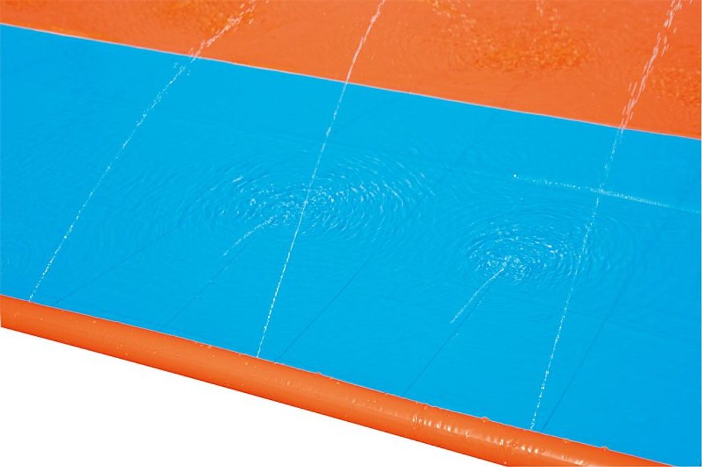 Bestway dvojitá vodní skluzavka se hodí na každou zahradu. Letní zábava začíná! Sestavení je velmi snadné – stačí připojit zahradní hadici a můžete se začít klouzat. Skluzavka má 2 pruhy dlouhé téměř 5 metrů, takže si děti užijí hladkou, rychlou a mokrou jízdu a můžou závodit s kamarády. Zabudované postřikovače vytvářejí kaskádový efekt a udržují dráhy kluzké. Na konci skluzavky stéká voda do bazénku, takže v cílí čeká každého mokrá odměna. Součástí skluzavky je vypouštěcí ventil. Obsahuje: 1 nafukovací skluzavka, 1 opravná sada. Délka: 488 cm. Rozměr balení: 30 x 30 x 5 cm. Věk: 3+. Používejte výhradně venku a pouze pod dohledem dospělé osoby.