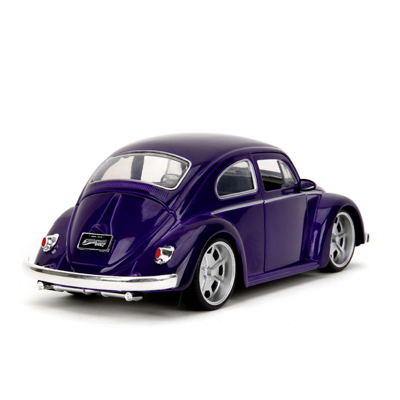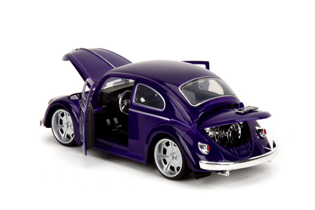Kovový model auta VW Beetle v měřítku 1:24 na volnoběh, otevírací dveře. Součástí balení je figurka Wednesday Addamsové. Velikost 19 cm.
