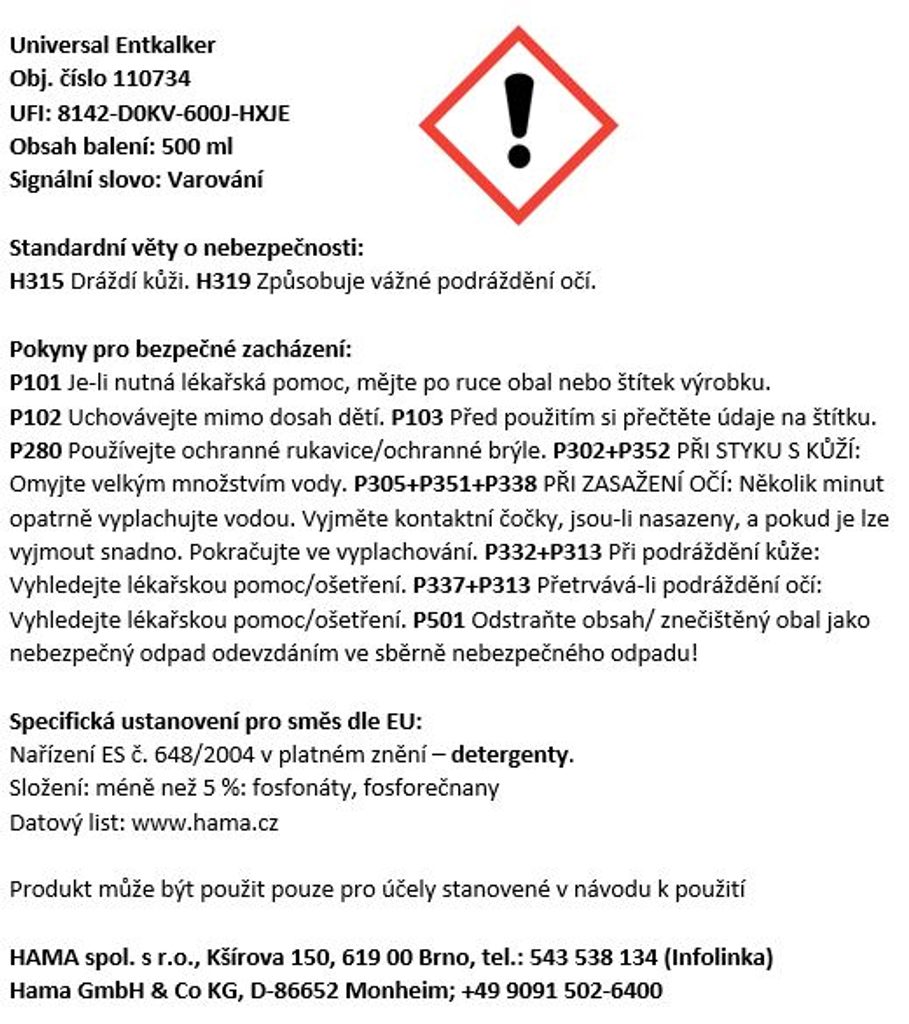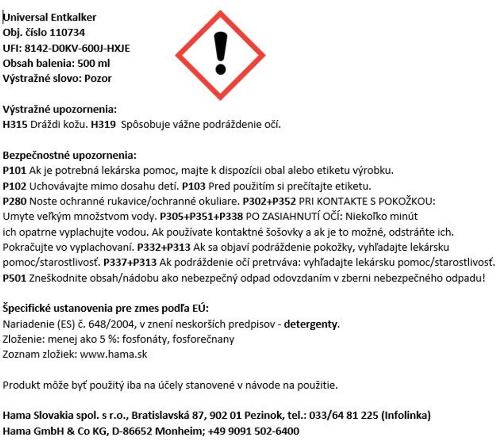 UPOZORNENIE! Dráždi oči a pokožku. Nesmie sa dostať do rúk deťom. V prípade požitia okamžite vyhľadajte lekársku pomoc a ukážte im etiketu alebo balenie. Zabráňte kontaktu s očami a pokožkou. Pri zasiahnutí očí ich vypláchnite pod tečúcou vodou a vyhľadajte lekára. Pri zasiahnutí pokožky ju dôkladne opláchnite vodou. Odpady a nádobky musia byť zodpovedajúcim spôsobom odstránené. Informácie pre zdravotnícky personál nájdete na www.hama.com