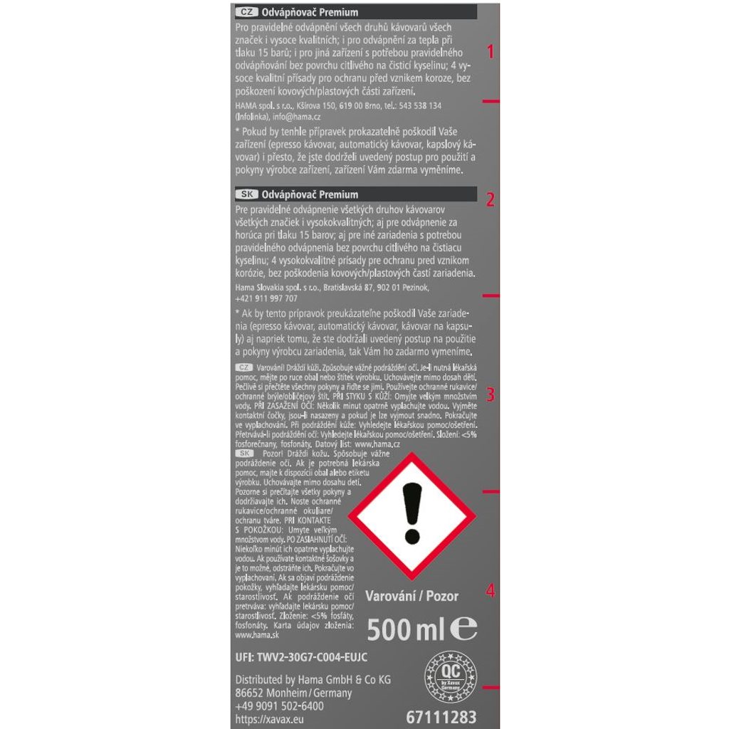 - obsahuje 4 vysoce kvalitní přísady, díky kterým je odvápňovač šetrný ke kovovým i plastovým částem zařízení a nepoškodí je