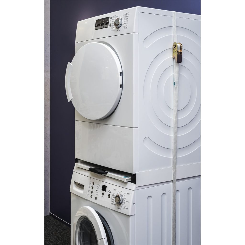 - Wrap the strap around the entire column (comprising the washing machine and laundry drier), thread it through the ratchet and lash tight