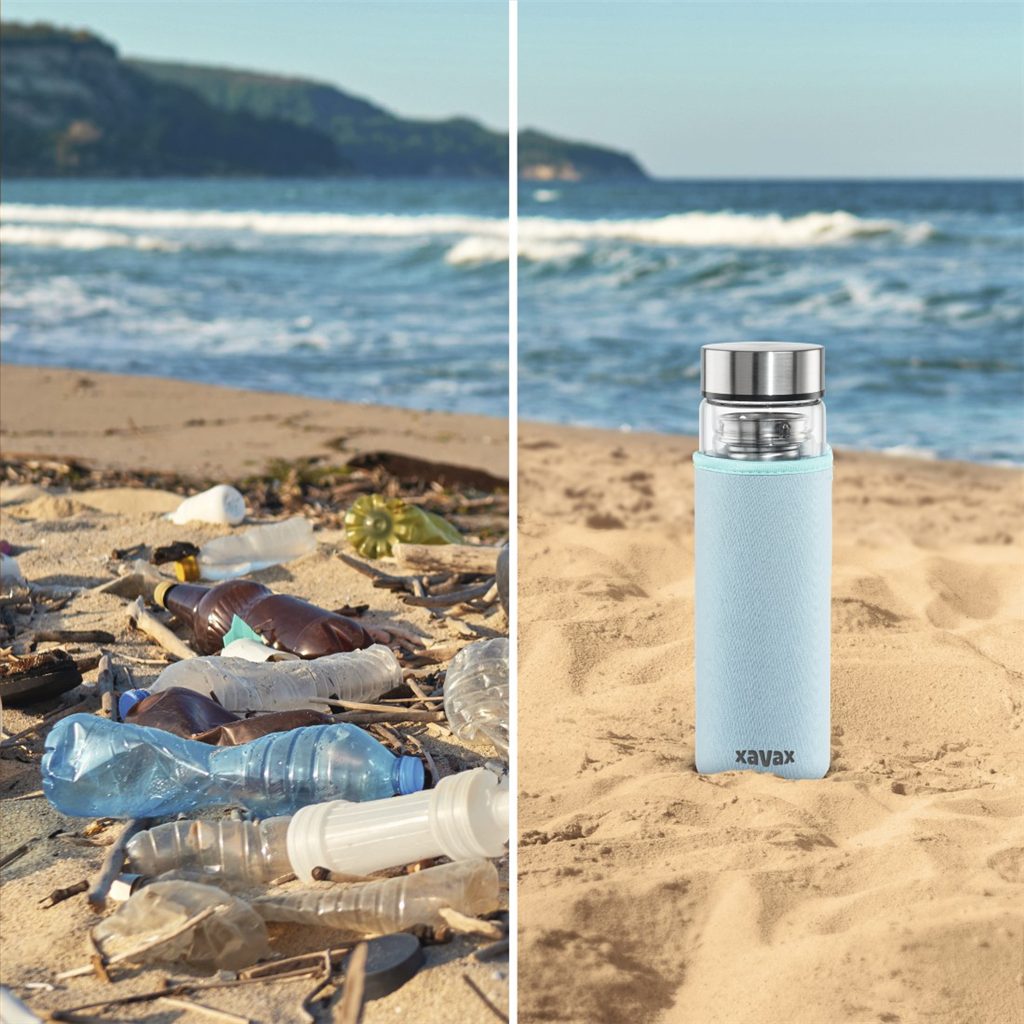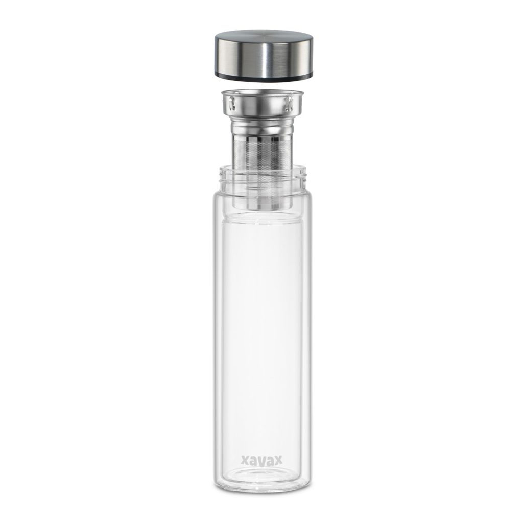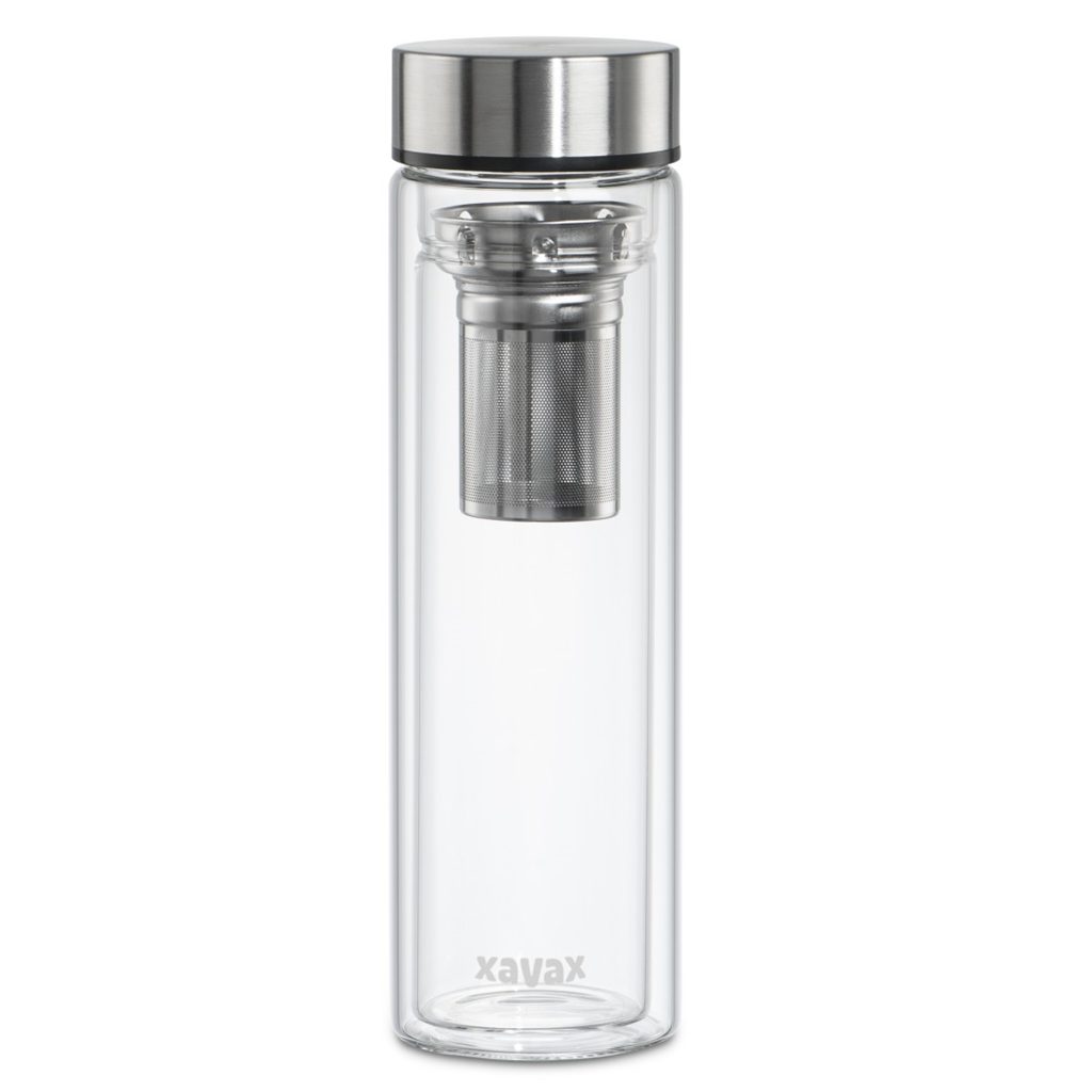 Xavax To Go, skleněná lahev na horké/studené/sycené nápoje, 450 ml, sítko, neoprenový obal