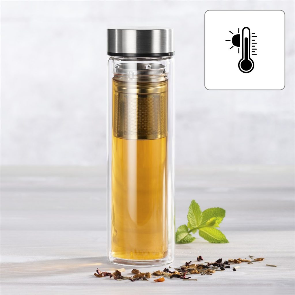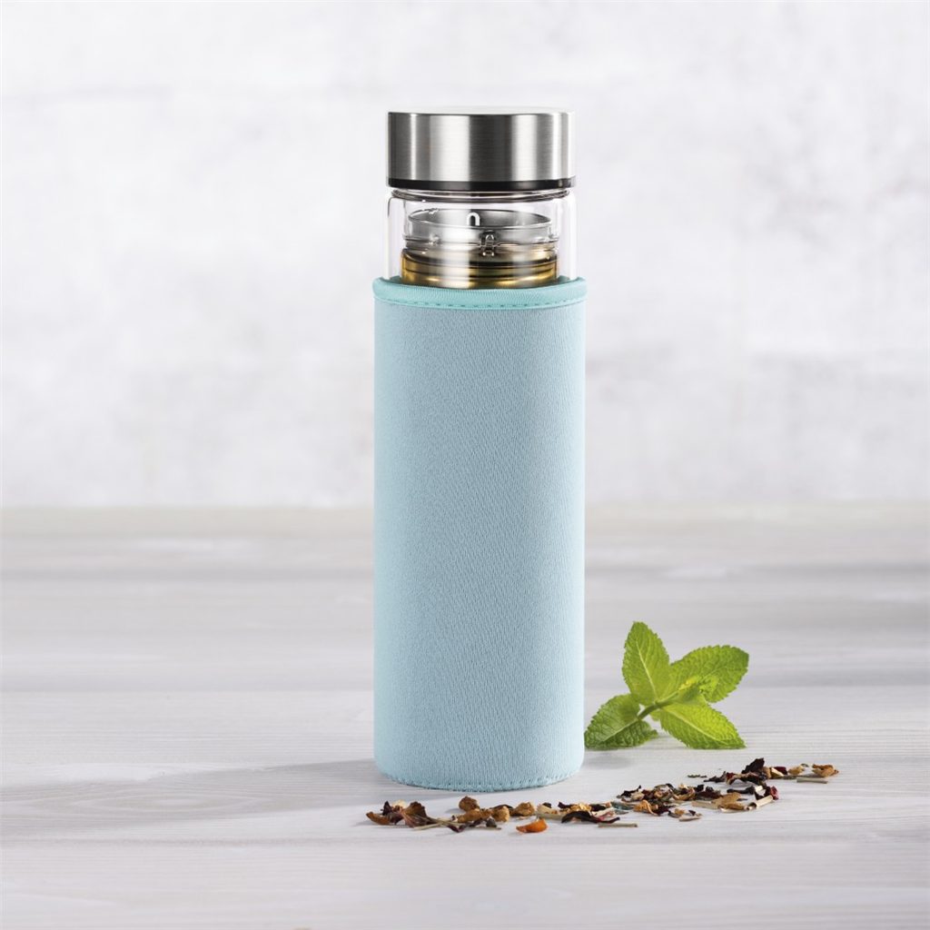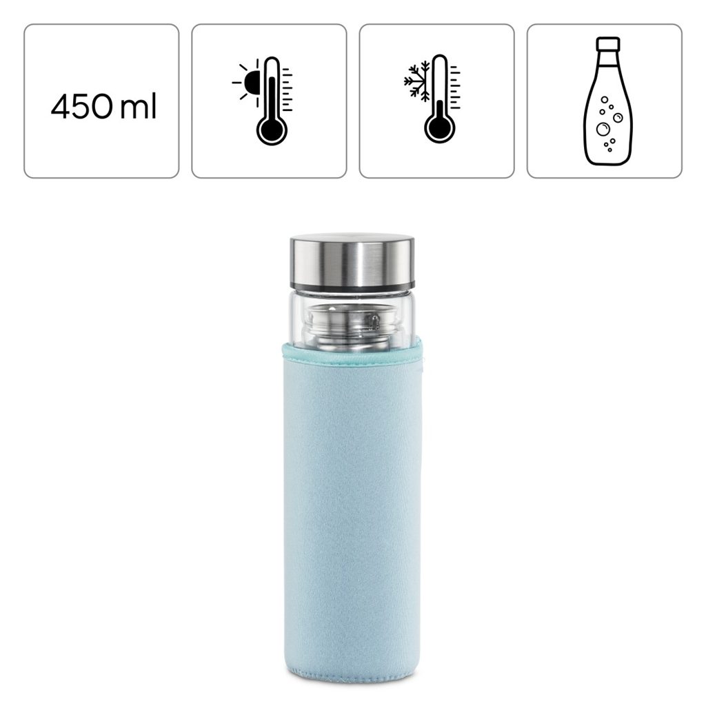 - materiál: sklo (lahev), nerez (sítko, víčko), neopren (obal)