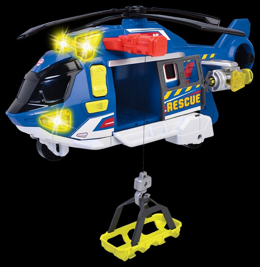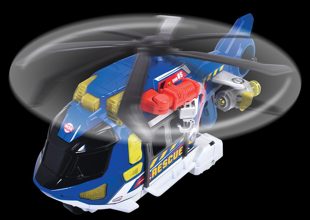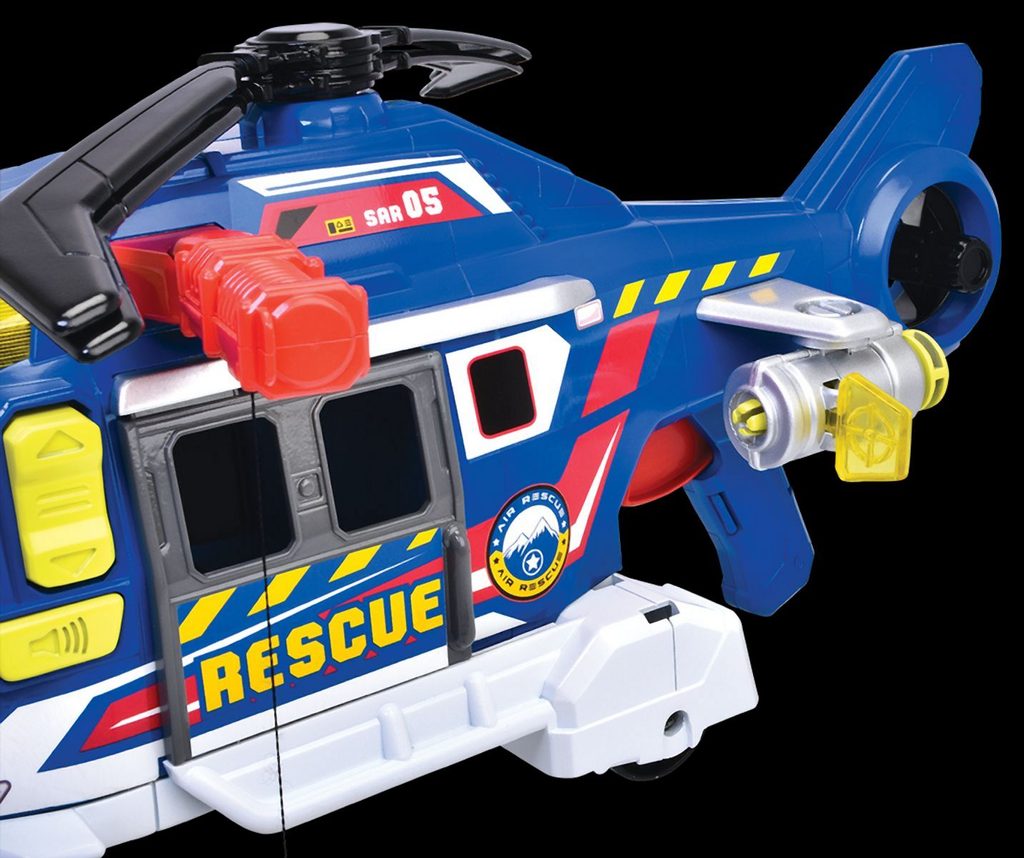 Helikoptéra na volnoběh, světelná a zvuková funkce, mechanický pohyb vrtule, otevírací dveře a pohyblivé části. Součástí je lehátko, které se ovládá tlačítkem (nahoru/dolů). Délka 39 cm.