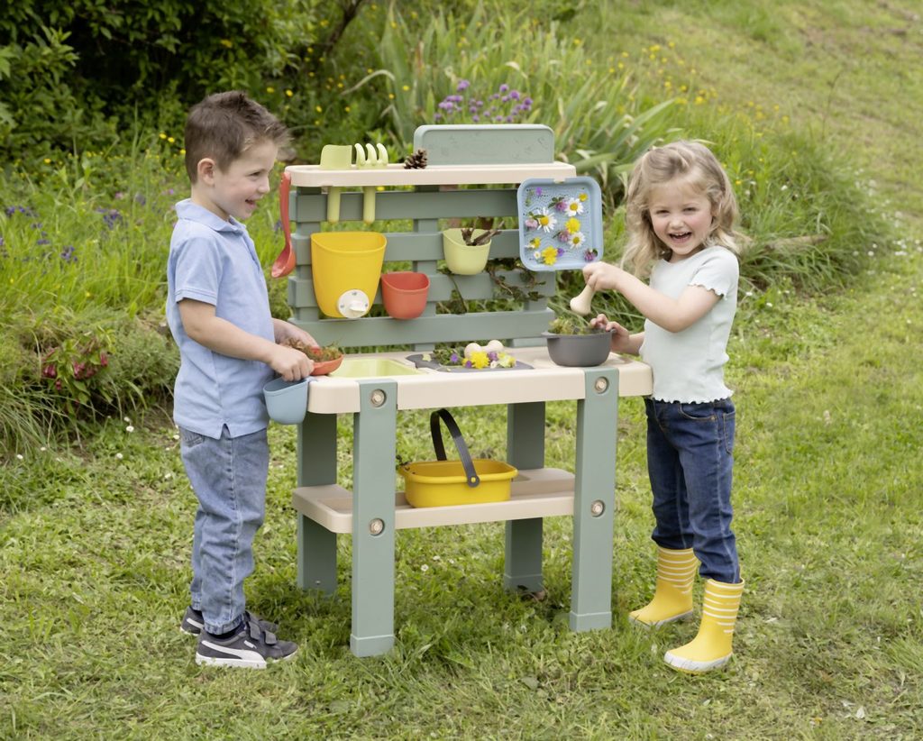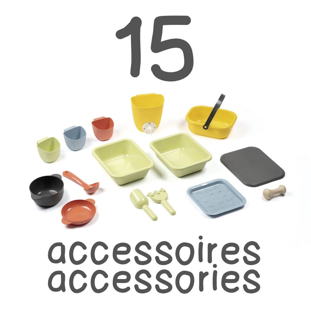 Venkovní kuchyňka vybavená různým příslušenstvím, celkem 15 ks doplňků. Plastové díly jsou ošetřeny anti-UV, což zajišťuje dobrou odolnost a stálost barev v průběhu času. Tento výrobek obsahuje minimálně 90% recyklovaného materiálu. Rozměry výrobku (DxŠxV): 72 x 36 x 99 cm.