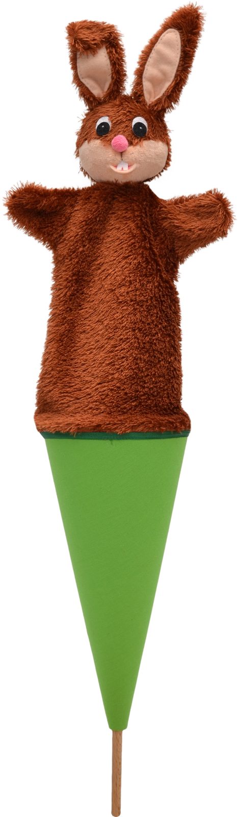Velký textilní kornoutový maňásek, ovládaný dřevěnou tyčkou, s otvorem pro ovládání ručiček. Vyrobeno v ČR.