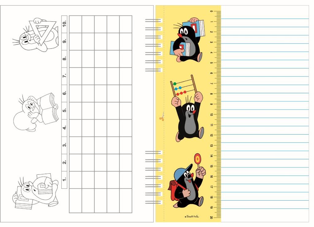 120 stran (z toho 60 stran s linkami), obálka pevná, lesklá s povrchovou úpravou proti oděru, na rubové straně umístěn rozvrh a nedatový kalendář na školní období, pevnou součástí výrobku je i záložka s měřítkem, vazba kroužková