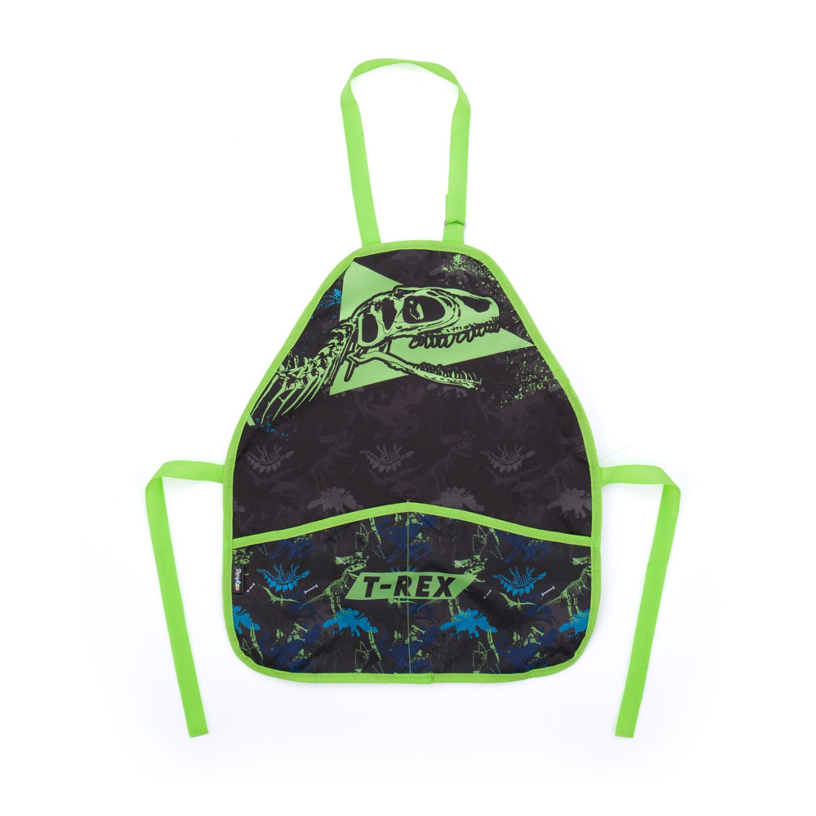 Zástěra s motivem T-rex do výtvarné výchovy či na jiné tvořící aktivity. Zapínání na sponku kolem krku (délka max. 50 cm), v pase šňůrky na zavázání (max. 80 cm). Vpředu dvě prostorné kapsy.