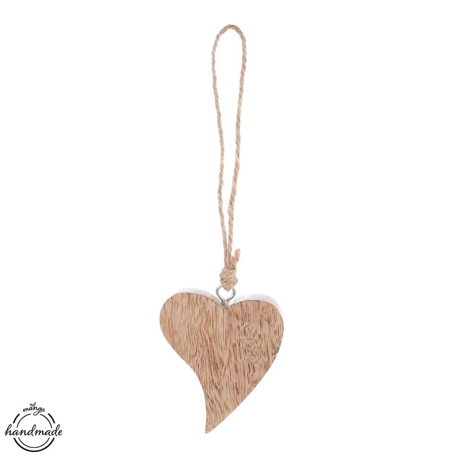 Krásná dekorace srdce z mangového dřeva je stylovým doplňkem, který zaujme na první pohled a zároveň potěší i jako vkusný dárek. Díky ruční výrobě má každý kus svůj originální charakter. Dekoraci je možné zavěsit na stěnu, na dveře, ale i na vánoční stromeček, takže ji využijete při různých příležitostech po celý rok. Materiál: mangové dřevo, kov, juta. Rozměry: 6x8x1 cm.