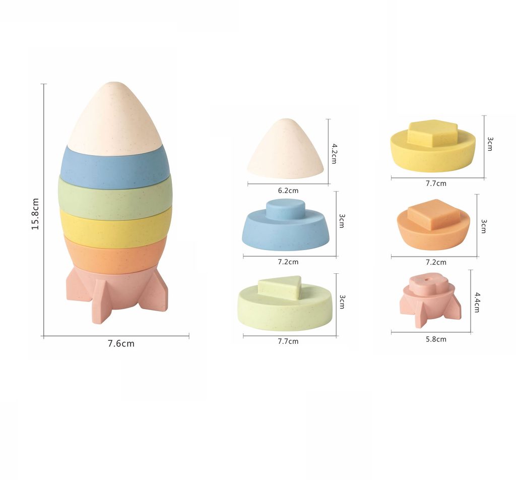 Učí rozeznávat barvy a tvary. Rozvíjí dětskou motoriku a koordinaci ruka oko. Stohovací raketa tvary