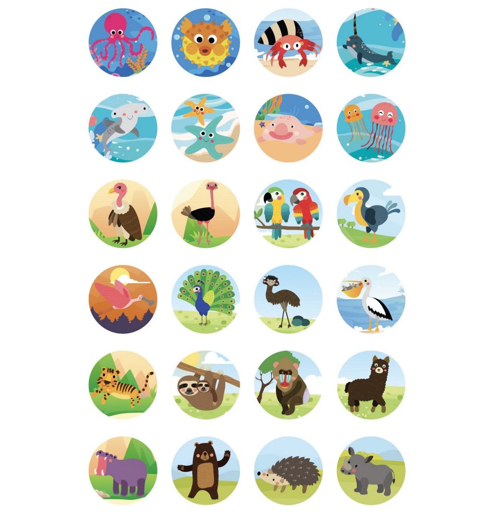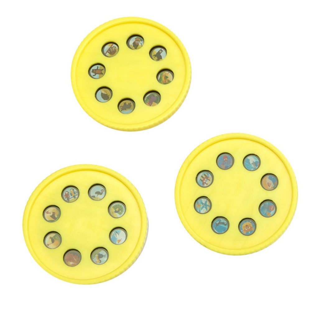 Světelný LED projektor obsahuje 3 diapozitivy po 8 motivech zvířátek k promítání např. na zeď. Velikost projektoru 12 cm.