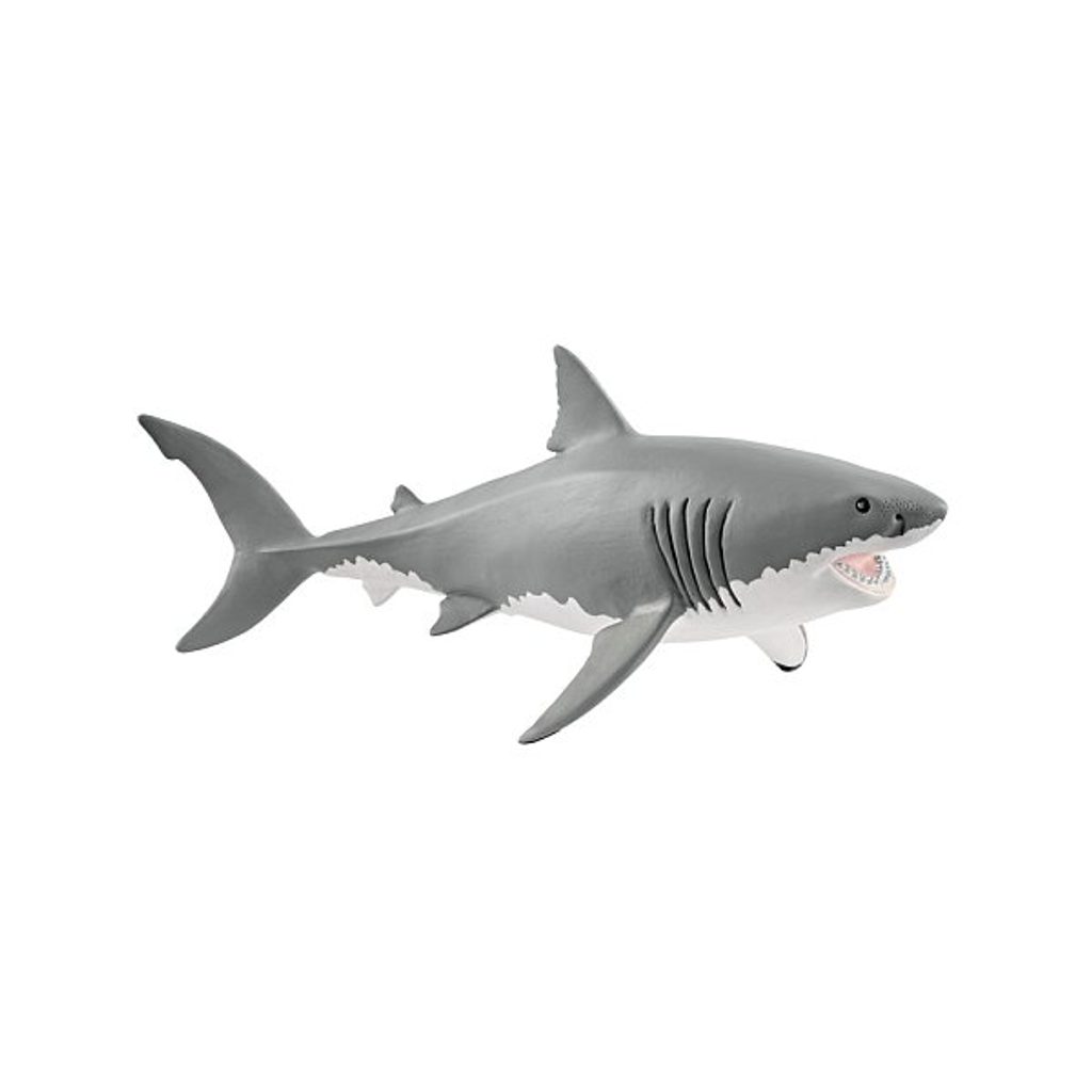 Žralok bílý se vyskytuje většinou v pobřežních vodách. Dosahuje maximální délky kolem 5 metrů a hmotnosti i více než 1 tuna. Dožívá se i více než 70 let. Patří k nejrychlejším žralokům, může nakrátko zrychlit až na 56 km/h. Živí se především mořskými rybami a savci (zvláště ploutvonožci), v menší míře i plazy a ptáky. Žralok má řady jemně vroubkovaných trojúhelníkovitých zubů, které se často obměňují a nahrazují zuby vypadlé. Když se žralok zakousne, třese hlavou ze strany na stranu, čímž používá čelisti jako ozubenou pilu oddělující maso. Jeho jediným predátorem mimo člověka je kosatka dravá. Rozměr: 17,7 x 7,8 x 8 cm. Nevhodné pro děti do 3 let. Doporučený věk: 3-8