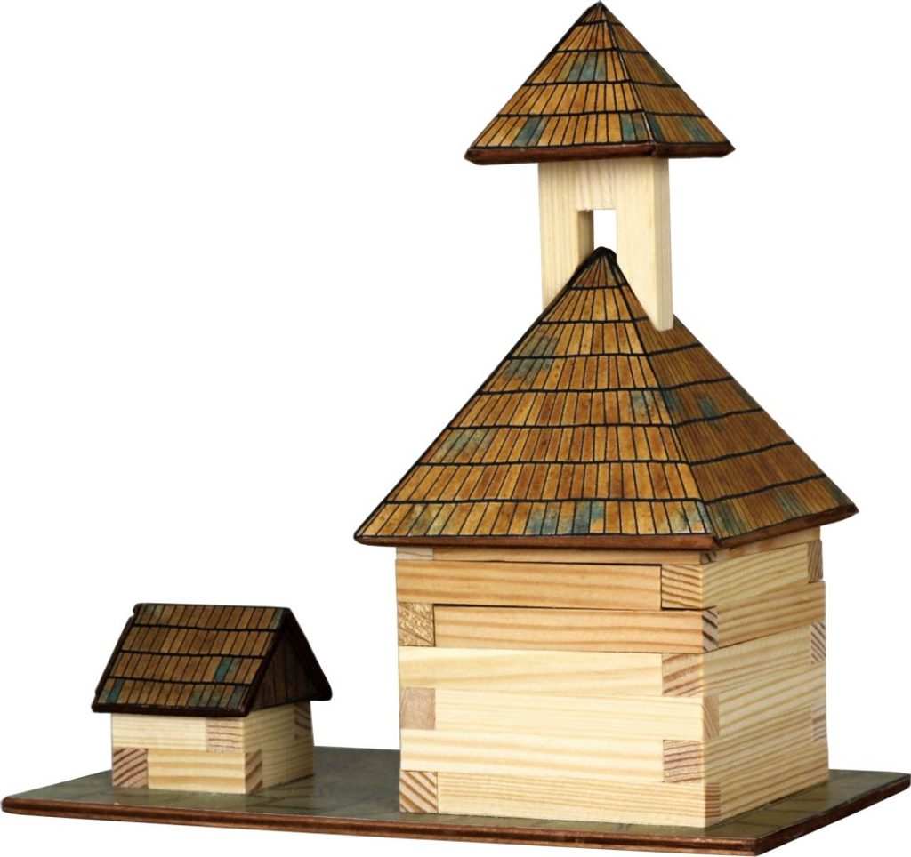 Dřevěná slepovací stavebnice Walachia - Zvonice a studna. Slepovací stavebnice Walachia jsou dřevěné modely domečků a staveb z Valašského kraje v měřítku 1:32. Základem jsou dřevěné hranolky 9x9 mm a k tomu jsou v sadě vždy všechny papírové doplňky - okna, dveře, střešní části atd. Pro lepení se používá lepidlo Herkules, není však součástí stavebnice. Přiložený je montážní návod a malé kapitoly z historie lidové architektury. Níže je označení obtížnosti číslem 1 - 5, přičemž 1 je nejlehčí. Rozměry: 9 x 9 x 17 cm Počet dílů: 68 Obtížnost: 3
